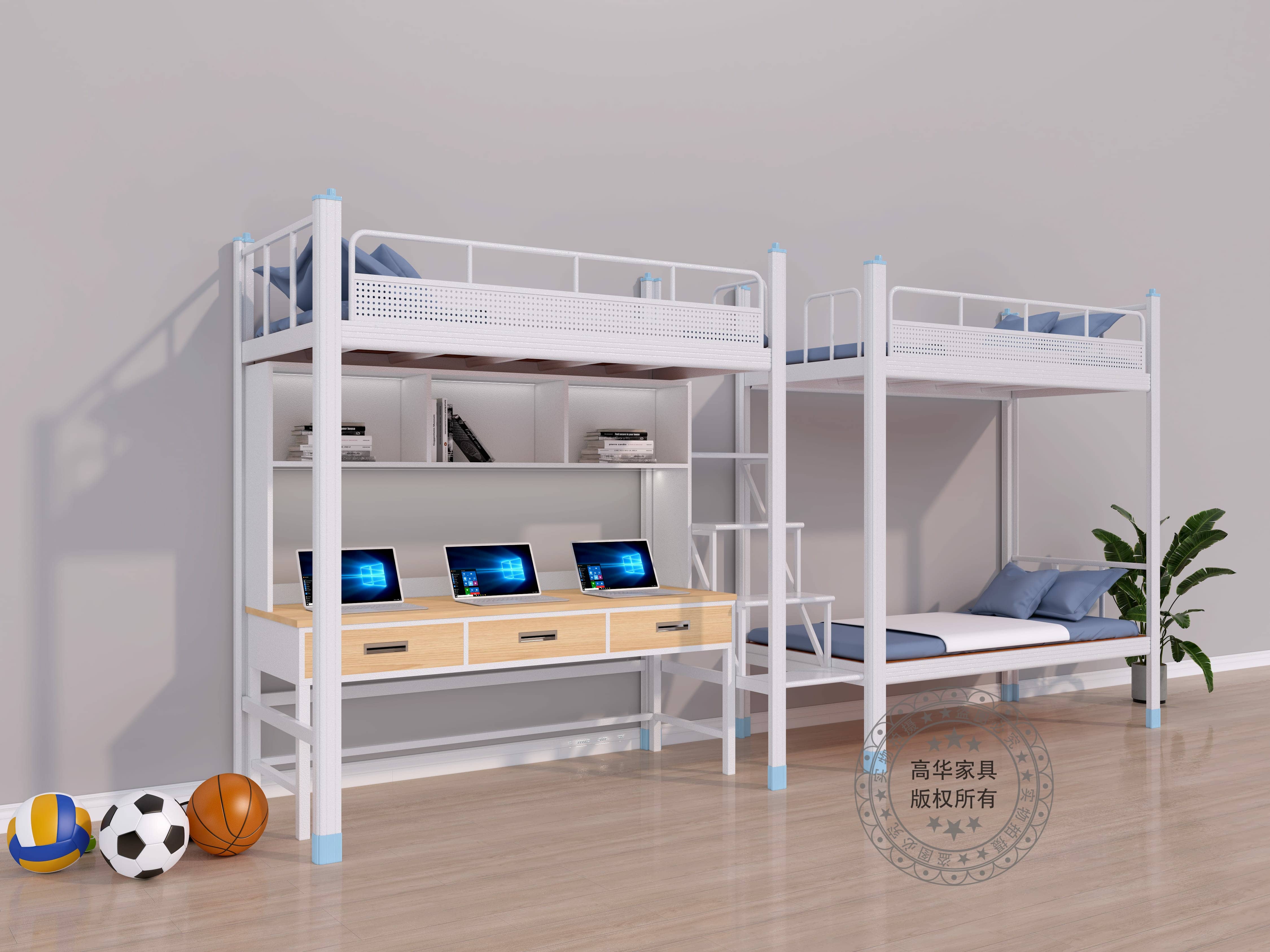 廣東高華家具學生公寓床廠家的兩連三位中上走梯公寓床-GH-G-043款式新穎,功能實用,采用環保0甲醛烤漆,無論悶熱潮濕都恍然如新。 工藝設計上,采用先進的卡口式連接,這種連接的優點在于承重性強,穩固性好,上下床時非常平穩,不易搖晃,安全舒適,整張床可承重500公斤,經久耐用且十年質保,可以適應各類宿舍。